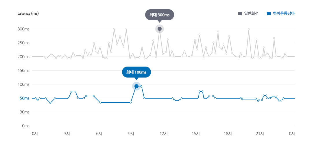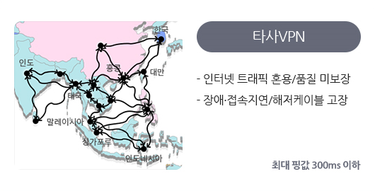 | 접속속도 | 95~160ms(속도 미보장) | 30~40ms(IPLC*급) | 30~40ms(IPLC*급) |
